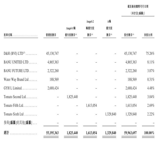 此外,BANU FUTURE LTD.持股为3.87%,Water Way Brand持股为0.31%,GYH L持股为4.48%,Tomato Second持股为3.04%,Tomato Fifth持股为2.69%,Tomato Sixth持股为2.22%。