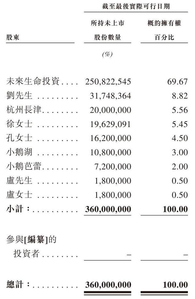 IPO前,未来生命投资持股为69.67%,刘杰持股为8.82%,杭州长津持股为5.56%,徐思英女士持股为5.45%,孔女士持股为4.5%,小鹅湖持股为3%,小鹅芭蕾持股2%,卢先生、卢女士分别持股为0.5%。