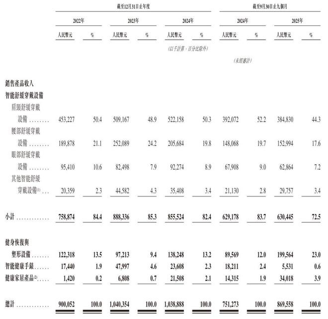 SKG未来健康2025年前9个月来自健身恢复与塑形设备收入为2亿元,占比为23%;来自智能健康手表收入为553万元,占比为0.6%;来自健康家居产品收入为3402万元,占比为3.9%。