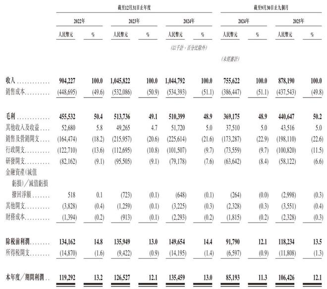 招股书显示,SKG未来健康2022年、2023年、2024年营收分别为9亿、10.46亿、10.45亿元;毛利分别为4.56亿、5.14亿、5.1亿元;期内利润分别为1.19亿、1.27亿、1.35亿元。