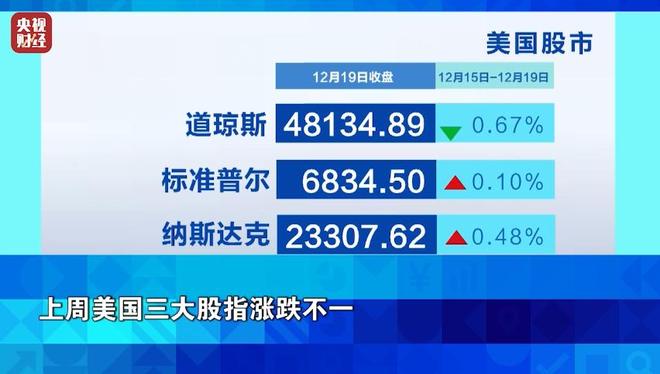 上周,由于市场对人工智能行业估值过高的担忧仍在持续,一度引发美股剧烈波动,但上周四公布的数据显示美国11月通胀超预期降温,市场对美联储明年降息的预期升温提振股市。上周美国三大股指涨跌不一,道指全周累计下跌0.67%,标普500指数上涨0.10%,纳指上涨0.48%。