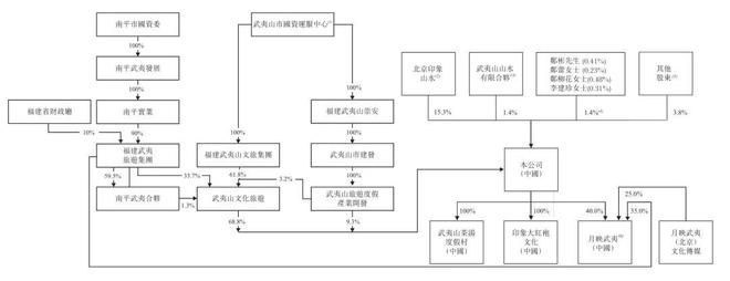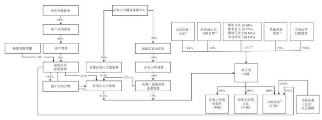 IPO后,武夷山文化旅游持股为51.6%,北京印象山水持股为11.4%,武夷山旅游度假产业开发持股为7%,武夷山山水有限合伙持股为1.1%;