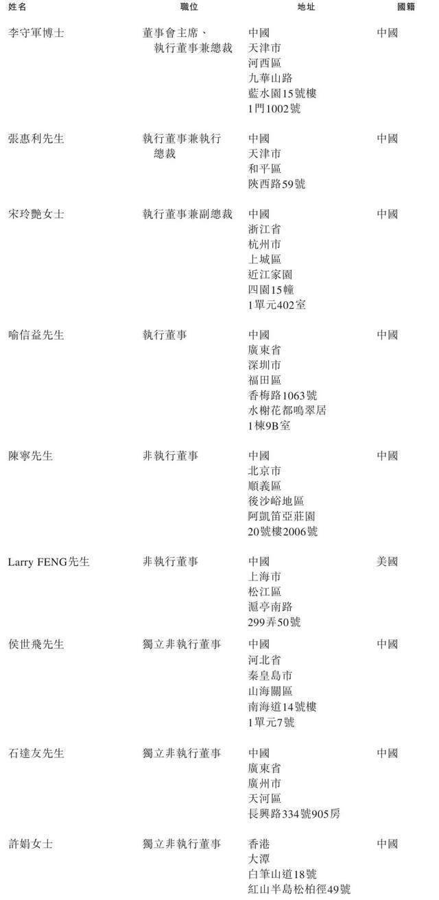 李守军为公司董事会主席兼总裁,张惠利为执行总裁,宋玲艳女士为副总裁。