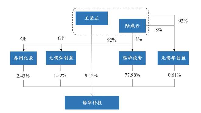 IPO前,王荣正、陆燕云分别持有锡华投资92%、8%股权,锡华投资持有公司77.98%股权;此外,王荣正直接持有公司9.12%股权,并通过担任泰州亿晟、无锡弘创盈、无锡华创盈执行事务合伙人,合计控制公司4.56%股权对应的表决权。