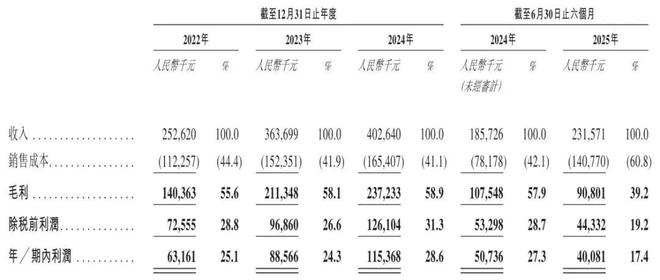 招股书显示,诺比侃2022年、2023年、2024年营收分别为2.53亿元、3.64亿元、4亿元;毛利分别为1.4亿元、2.11亿元、2.37亿元;期内利润分别为6316万元、8857万元、1.15亿元;期内利润率分别为25.1%、24.3%、28.6%。