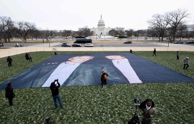 12月15日,美国华盛顿,一些活动人士在国会大厦附近展示了美国总统特朗普(右)和杰弗里·爱泼斯坦的巨幅照片。图/视觉中国