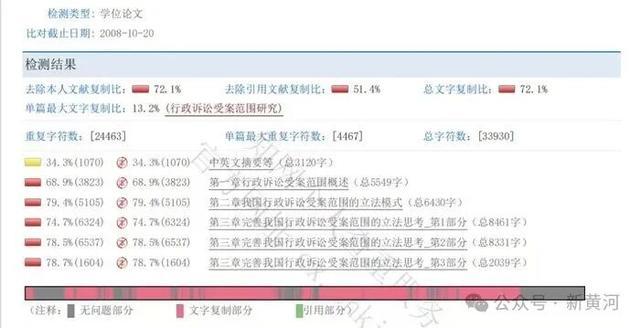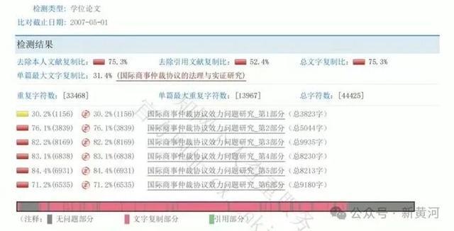 近日,有网友向新黄河记者反映,天津警察学院科研处处长杨某某、图书馆副处长张某某的硕士学位论文查重率均超70%,二人均毕业于天津南开大学。在该网友向记者展示的知网查重报告里,记者看到杨某某的硕士论文《我国行政诉讼受案范围研究》完成于2008年,知网查重报告显示总文字复制比72.1%(比对截止日期2008年10月20日)。张某某的《国际商事仲裁协议效力问题研究》完成于2007年,总文字复制比达75.3%(比对截止日期2007年5月1日)。