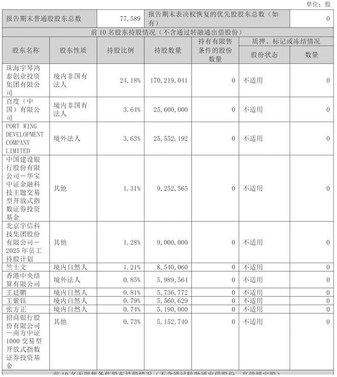 截至2025年9月30日,洪卫东通过珠海宇琴鸿泰创业投资集团有限公司持股为24.18%,百度持股为3.64%,茗峰开发有限公司持股为3.63%,中国建设银行股份有限公司-华宝中证金融科技主题交易型开放式指数证券投资基金持股为1.31%;