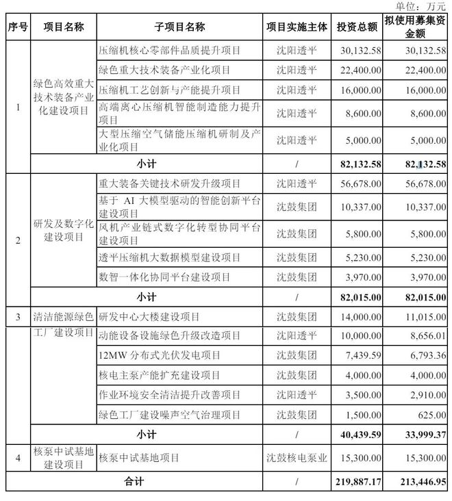 沈鼓集团计划募资21.34亿元,其中,8.2亿元用于绿色高效重大技术装备产业化建设项目,8.2亿元用于研发及数字化建设项目,3.4亿元用于清洁能源绿色工厂建设项目。1.53亿元用于核泵中试基地建设项目。