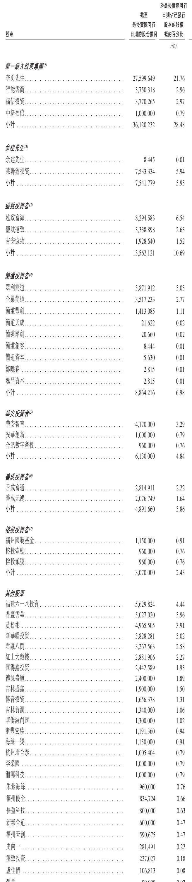 华安智车持股为3.29%,安华创新持股为0.79%,合肥数字产投持股为0.76%,一共持股为4.84%;善成富通持股为2.22%,善成元鸿持股为1.64%,一共持股为3.86%;