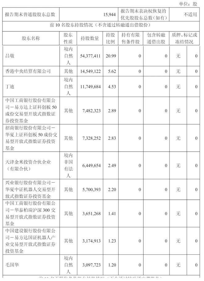 中国工商银行股份有限公司-易方达上证科创板 50 成份交易型开放式指数证券投资基金持股为3.31%,小米旗下天津金米投资合伙企业(有限合伙)持股2.93%,兴业银行股份有限公司-华夏中证机器人交易型开放式指数证券投资基金持股为1.79%;