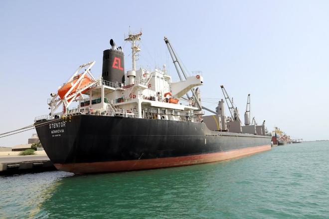 2019年5月14日,在也门荷台达港,一艘货轮停在港口 资料图/新华社发