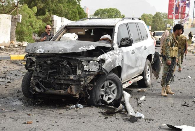 2022年6月29日,安全人员聚集在也门亚丁的汽车炸弹袭击现场 图/新华社发(穆拉德·阿卜杜摄)