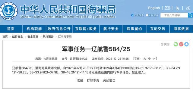 据中国海事局网站消息,大连海事局发布航行警告,2025年12月28日16时至2026年1月4日16时,渤海海峡黄海北部部分水域范围内执行军事任务,禁止驶入。
