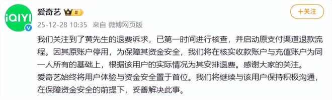 12月28日,爱奇艺官方微博发文称,关注到用户黄先生的退费诉求,已第一时间进行核查,并启动原支付渠道退款流程。因其原账户停用,为保障其资金安全,我们将在核实收款账户与充值账户为同一人所有的基础上,根据该用户的实际情况为其安排退费。