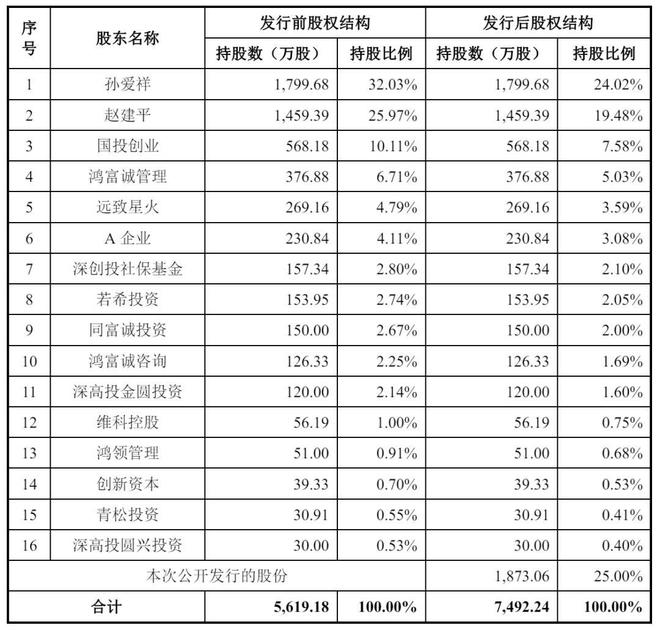 IPO后,孙爱祥持股为24%,赵建平持股为19.48%,国投创业持股为7.58%,鸿富诚管理持股为5.03%,远致星火持股为3.59%,深创投社保基金持股为2.10%,若希投资持股为2.05%;