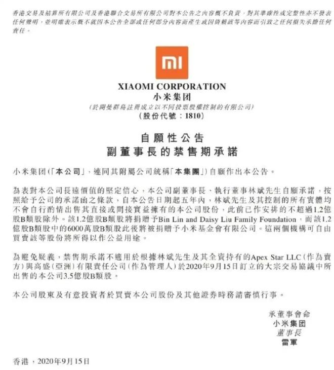 2019年8月,林斌出售小米部分股权,套现近4亿港元;2020年9月,林斌出售3.5亿股公司股票,套现总金额约10亿美元。