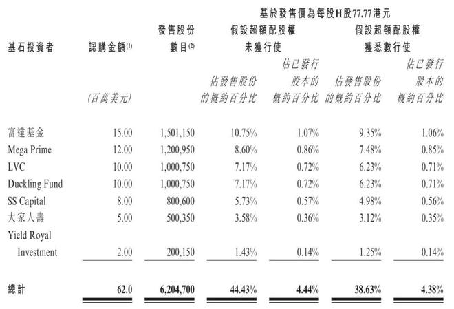 林清轩基石投资者分别为富达基金、大湾区共同家园投资有限公司旗下Mega Prime、林利军旗下LVC、Duckling Fund、SS Capital、大家人寿、Yield Royal,一共认购6200万美元,其中,富达基金认购1500万美元,Mega Prime认购1200万美元,LVC、Duckling Fund分别认购1000万美元,SS Capital认购800万美元,大家人寿认购500万美元,Yield Royal认购200万美元。