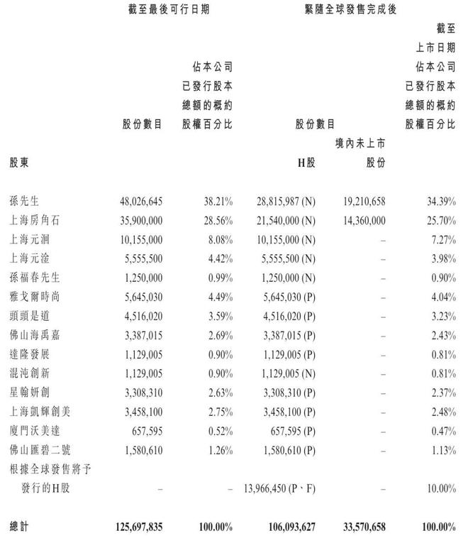 IPO前,孙来春直接持股为38.21%,上海房角石持股为28.56%,上海元洄持股为8.08%,上海元淦持股为4.42%,孙福春持股为0.99%,雅戈尔时尚持股为4.49%,吴晓波旗下头头是道持股为3.59%,上海凯辉创美持股为2.75%;