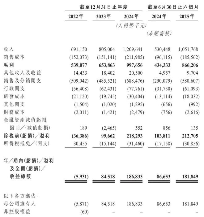 林清轩2025年上半年营收为10.52亿元,较上年同期的5.3亿元增长98.5%;毛利为8.66亿元,上年同期的毛利为4.34亿元;期内利润为1.82亿元,上年同期的期内利润为8665万元。