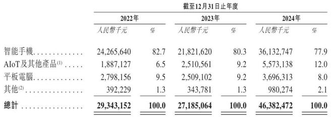龙旗科技2024年来自智能手机业务的收入361.33亿,占营收的比例为77.9%;来自AIoT及其他产品收入55.73亿,占比为12%;来自平板电脑的收入为37亿元,占比为8%;来自其他的收入为9.8亿元,占比为2.1%。