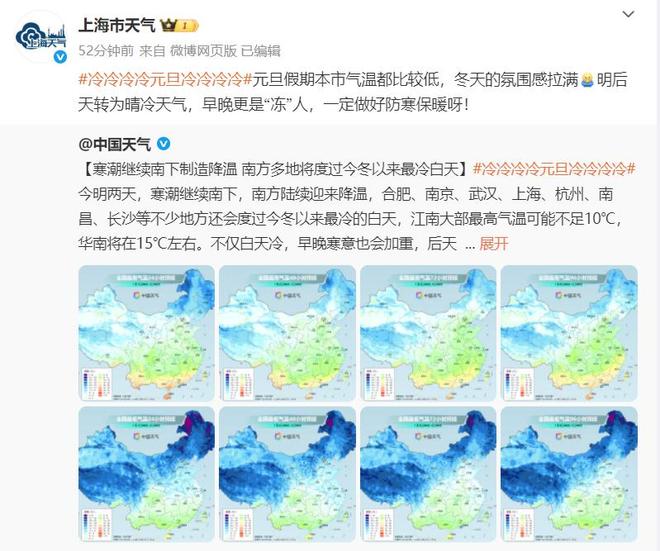 2日和3日上海转为晴冷天气,白天最高气温不超过7℃。早晚市区最低气温接近0℃,局部地区有薄冰,郊区更低一些,3日早间会出现-5℃~-3℃的冰冻天气,请注意添衣保暖。3日白天风力减弱,体感会有所改善。