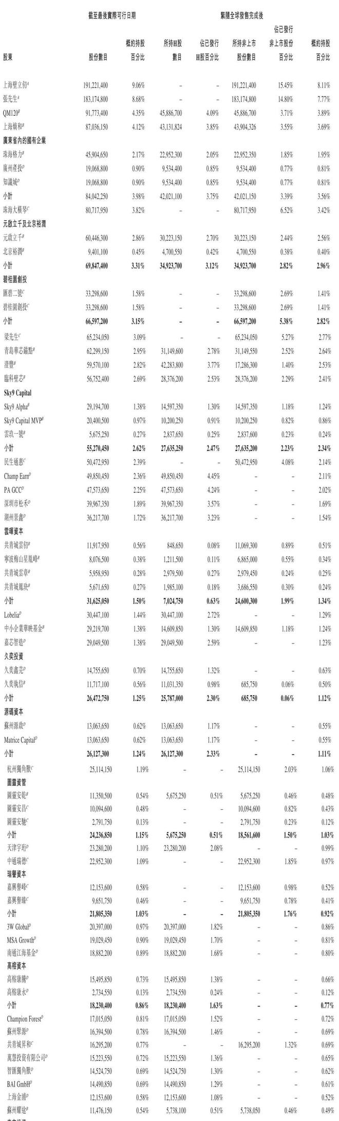 碧桂园创投持股为2.82%,梁晓嶢持股为2.77%,青岛华芯锚点持股为2.64%,澄丰持股为2.53%,临科壁芯持股为2.41%,Sky9 Capital持股为2.34%,民生通惠持股为2.14%,Champ Earn持股为2.11%,PA GCC持股为2.02%,深圳市松禾持股为1.69%,湖州景鑫持股为1.54%。