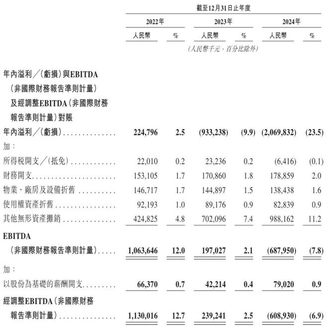 用友网络2022年、2023年、2024年EBITDA分别为10.64亿元、1.97亿元、-6.9亿元;经调整EBITDA分别为11.3亿元、2.39亿元、-6.1亿元。