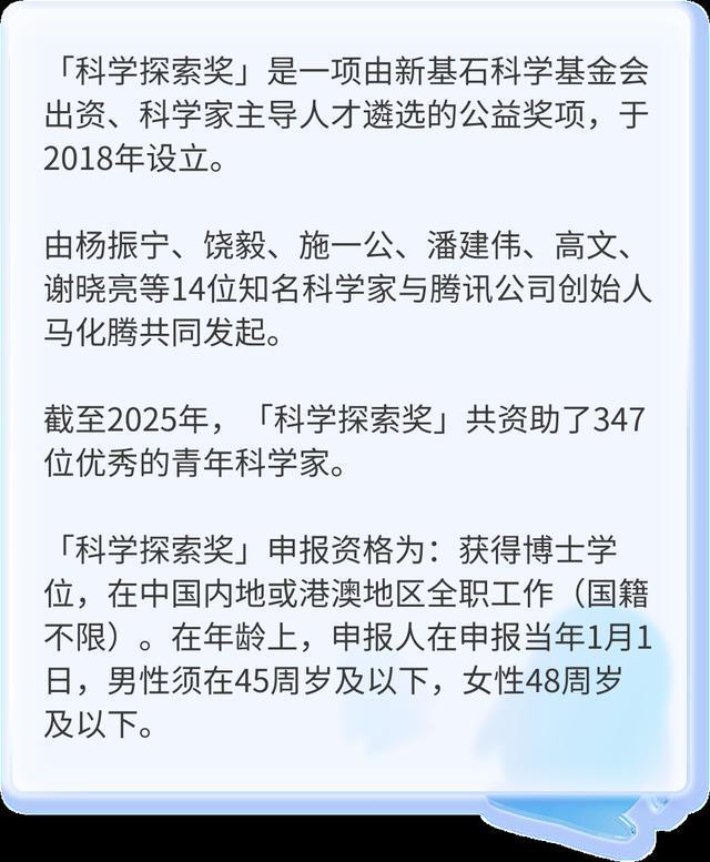 “科学探索奖”是一项由新基石科学基金会出资、科学家主导人才遴选的公益奖项,于2018年设立。由杨振宁、饶毅、施一公、潘建伟、高文、谢晓亮等14位知名科学家与腾讯公司创始人马化腾共同发起。至2025年,“科学探索奖”共资助了347位优秀的青年科学家。