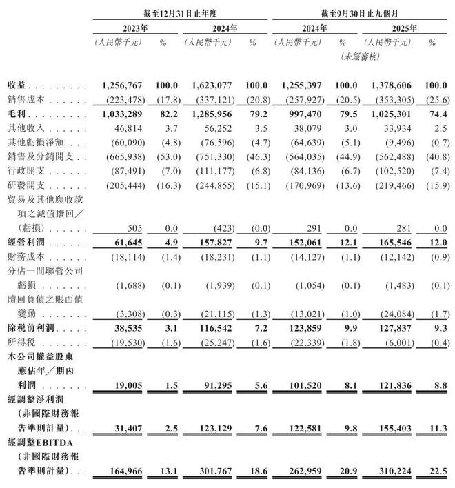 博锐生物2025年前9个月营收为13.79亿元,毛利为10.25亿元,经营利润为1.66亿,净利为1.22亿,经调整EBITDA为3.1亿元。