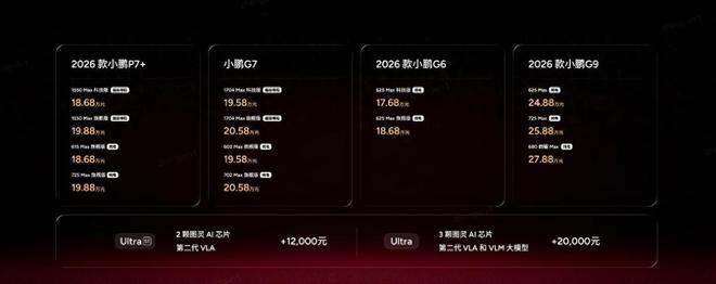 其中2026款小鹏P7+ 全球36国同步发布,新车有超级增程和纯电两种能源形式,超级增程有1550 Max 科技版和1550 Max 旗舰版,官方指导售价为18.68万元和19.88万元;纯电有615 Max旗舰版和725 Max 旗舰版,官方指导售价为18.68万元和19.88万元。2026款小鹏G7推出四个版本,超级增程1704 Max 科技版和1704 Max 旗舰版,官方指导售价为19.58万元和20.58万元;纯电602 Max 旗舰版和702 Max 旗舰版,官方指导售价为19.58万元和20.58万元。2026 款小鹏 G6推出纯电625 Max 科技版和625 Max 旗舰版,官方指导售价为17.68万元和18.68万元。2026 款小鹏 G9推出纯电625Max、725 Max和680 四驱Max版,官方指导售价为24.88万元、25.88万元和27.88万元。
