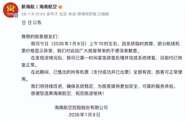 对此,海南航空官微午间发公告称,9日上午10时左右,因系统临时故障,部分航线机票价格显示异常,对此给广大旅客带来的不便深表歉意。在发现该情况后,公司已第一时间紧急排查处理并完成系统修复,目前均已恢复正常。在此期间,已售出的所有机票(支付成功并已出票)全部有效,旅客可正常使用。