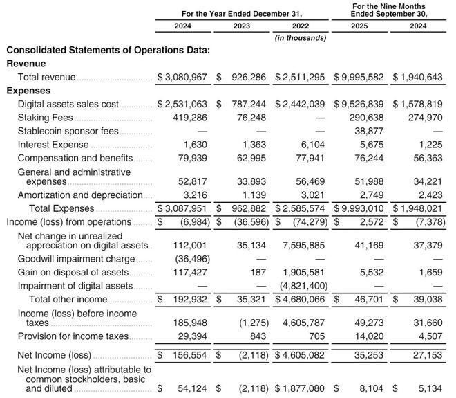 招股书显示,BitGo在2022年、2023年、2024年营收分别为25.11亿美元、9.26亿美元、30.81亿美元;运营亏损分别为7428万美元、3660万美元、698万美元;净利分别为46亿美元、-212万美元、1.57亿美元。