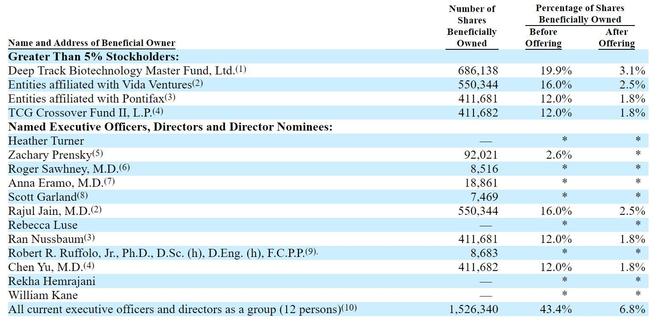 IPO前,Deep Track Biotechnology Master Fund持股为19.9%,Vida Ventures持股为16%,Pontifax、TCG Crossover Fund II分别持股为12%,Zachary Prensky持股为2.6%。