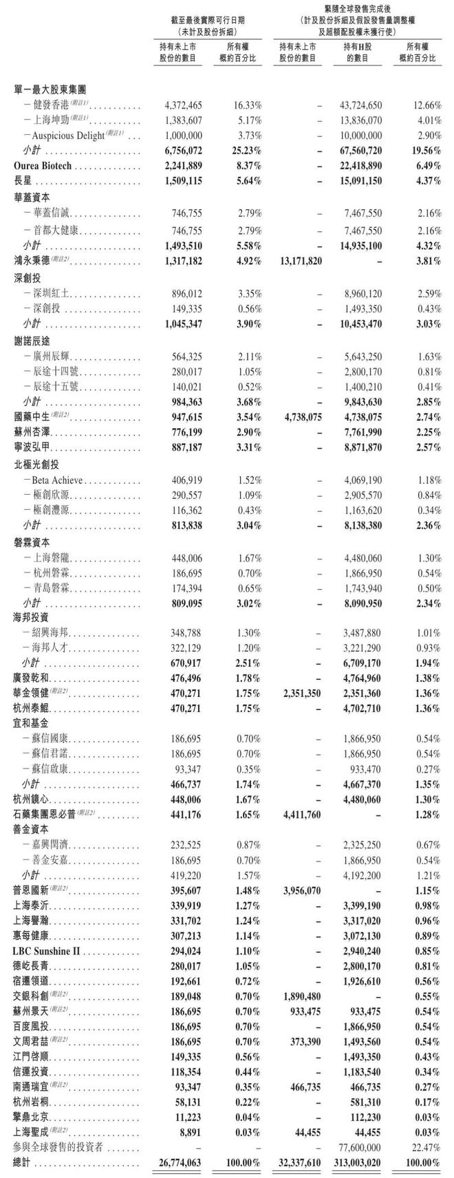 160 Health Future持股0.95%,WL Management持股为0.94%,珠海旭华持股为0.88%,JYQ Holding持股为0.84%,深圳远致持股为0.68%,盈信国富持股为0.57%,YYN Holdings、HQYZ分别持股0.42%,Zhonghui Management、乐致厦门分别持股为0.34%,FJH Limited持股为0.26%,深圳龙骏持股为0.21%。