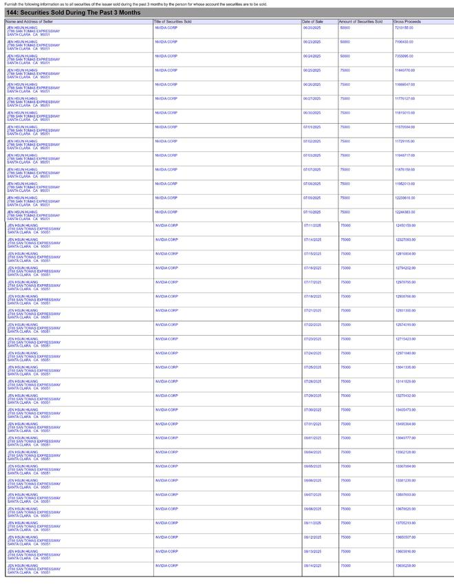 黄仁勋8月1日套现1305万美元,8月4日套现1336万美元,8月5日套现1337万美元,8月6日套现1338万美元,8月7日套现1360万美元,8月8日套现1367.86万美元,8月11日套现1371万美元,8月12日套现1365万美元,8月13日套现1360万美元,8月14日套现1364万美元,8月15日套现1348万美元。