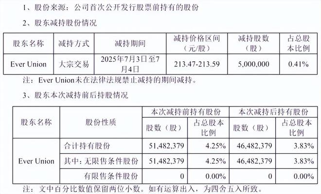 Ever Union的减持均价为213.47元到213.59元,以此计算,Ever Union套现10.67亿元。