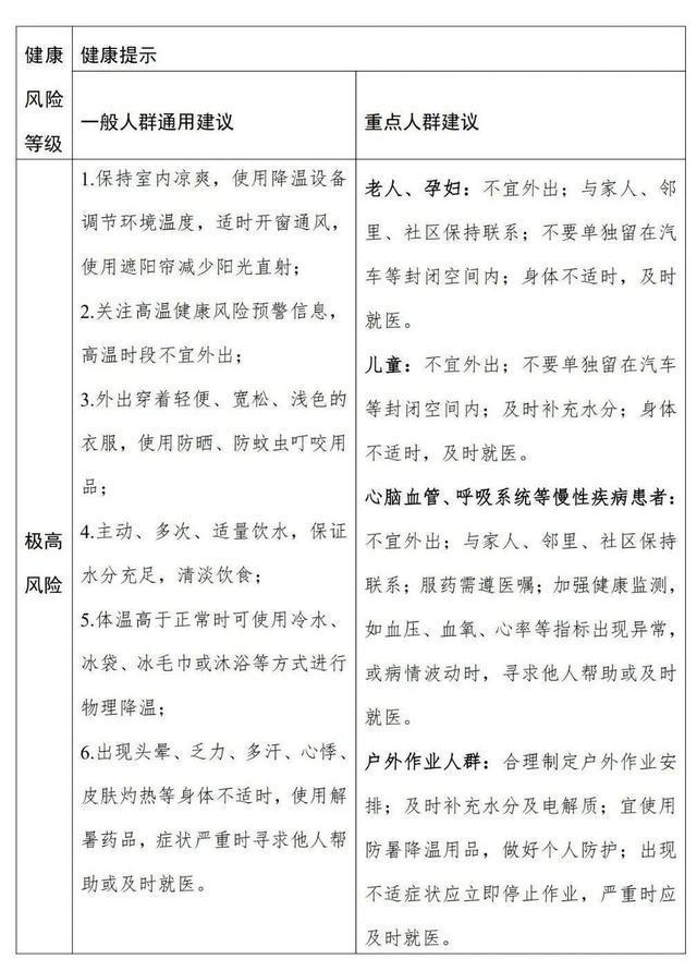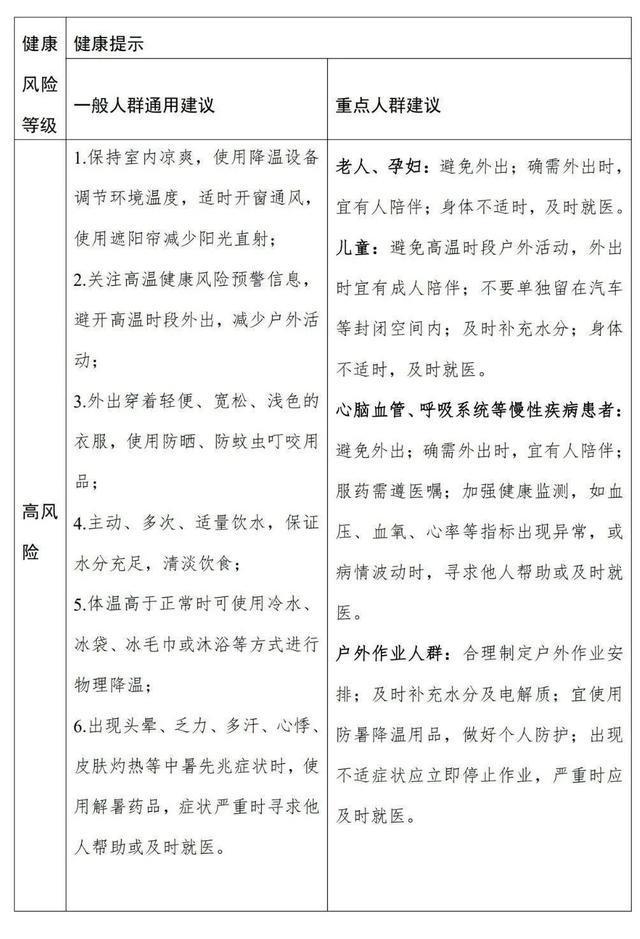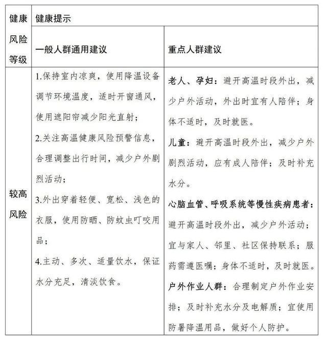 请公众及时关注预报信息变化,保持室内凉爽,合理调整出行时间,减少户外活动,保证充足饮水。老人、孕妇、儿童、慢性病患者外出宜有人陪伴,慢性病患者加强健康监测,如身体不适及时就医。户外作业者注意防暑降温。