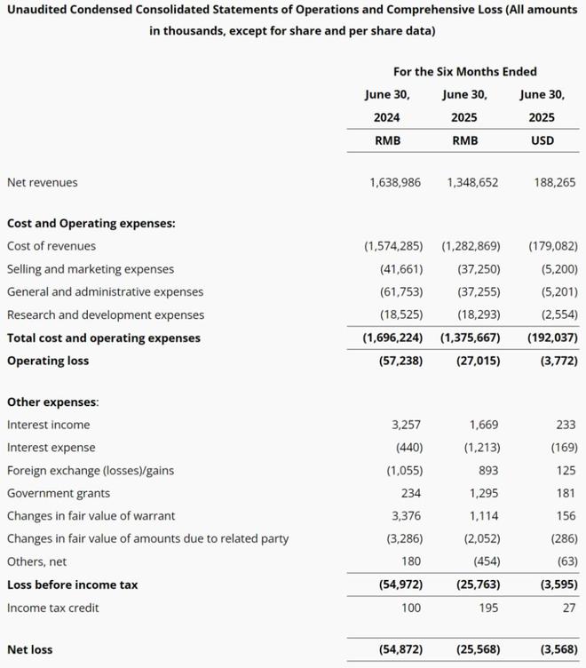 车车科技2025年上半年净营收为13.49亿元(约1.88亿美元),经调整净亏损为1050万元,较上年同期的2440万元收窄56.9%。