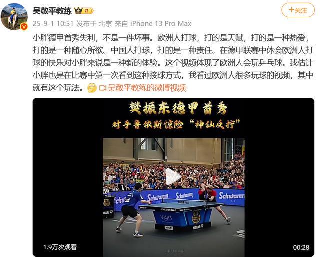 对此,樊振东恩师吴敬平发文点评:“小胖德甲首秀失利,不是一件坏事。欧洲人打球,打的是天赋,打的是一种热爱,打的是一种随心所欲。中国人打球,打的是一种责任。在德甲联赛中体会欧洲人打球的快乐对小胖来说是一种新的体验。这个视频体现了欧洲人会玩乒乓球。我估计小胖也是在比赛中第一次看到这种接球方式,我看过欧洲人很多玩球的视频,其中就有这个玩法。”