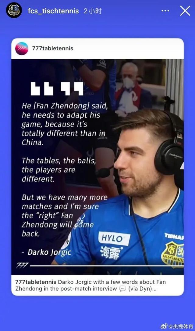 队长弗朗西斯卡发文:“兄弟,把头抬起来!”达科在赛后采访中表示:“樊振东说,他需要去调整自己的比赛方式,这里的球台、用球、对手都不一样。我相信‘真正的樊振东’一定会回来!”