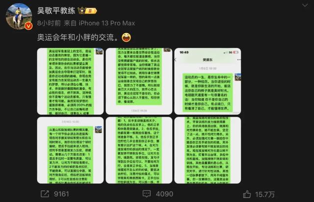 聊天记录中,吴敬平教练无时无刻不在关注着樊振东的比赛,从心理建设到技术提升都给予相应的建议和指导。