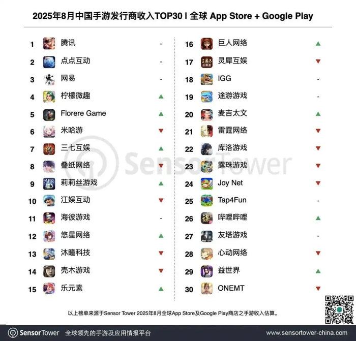 Sensor Tower8月发布的全球手游发行商收入榜TOP100中,有32家中国厂商上榜。据统计,这32家公司合计营收20.4亿美元,占榜单发行商总收入的35.1%。