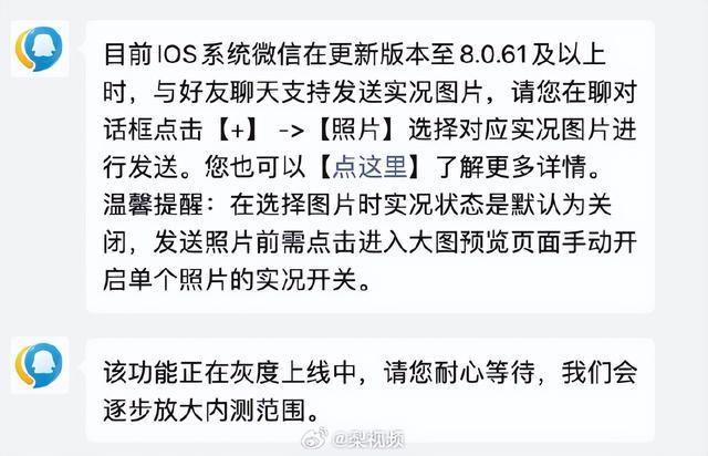 对于微信聊天收发live图功能,腾讯客服回应称:“目前IOS系统微信在更新版本至8.0.61及以上时,与好友聊天支持发送实况图片,请您在聊天对话框点击【+】-【照片】选择对应实况图片进行发送。”“安卓/鸿蒙用户因各品牌适配进度不同,我们正努力推进安卓/鸿蒙客户端相关适配工作,以满足更多用户需求,请耐心等待。”