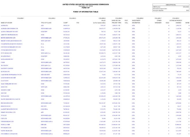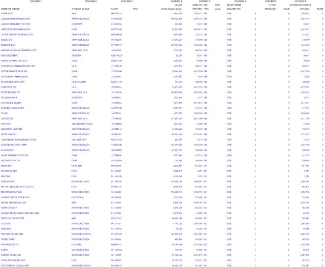 高瓴持有百济神州ADS价值约2.5亿美元,持有阿里巴巴约1.3亿美元,持有传奇生物价值约2.12亿美元。