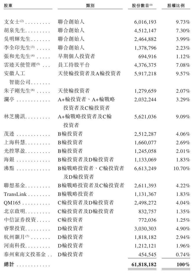 IPO前,支涛女士持股为9.73%,胡泉持股为7.30%,联合创始人吴明辉持股为3.99%,李全印持股为2.23%,张和光持股为1.12%,员工持股平台云迹天使管理持股为7.08%;