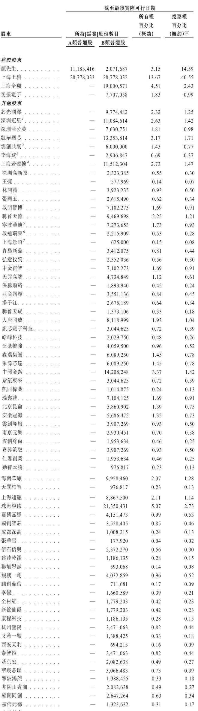 芯光润泽持股2.32%,深圳冠星持股2.63%,深圳蒲公英持股为1.81%,凯华国芯持股3.17%,云创共襄持股为1.43%,李海斌持股为0.69%,上海若谷怀持股为2.73%,深圳高新投持股为0.55%,林开涛持股为0.93%;