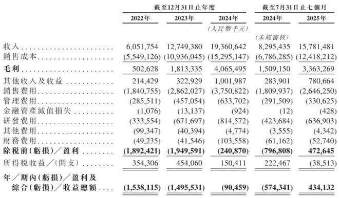 据招股书披露,岚图在销量、营业收入及毛利率等关键指标上均呈现持续跃升态势。于2022年、2023年、2024年及截至2025年7月31日止的7个月期间,岚图汽车分别实现销售19,409辆、50,285辆、80,116辆及66,680辆汽车。