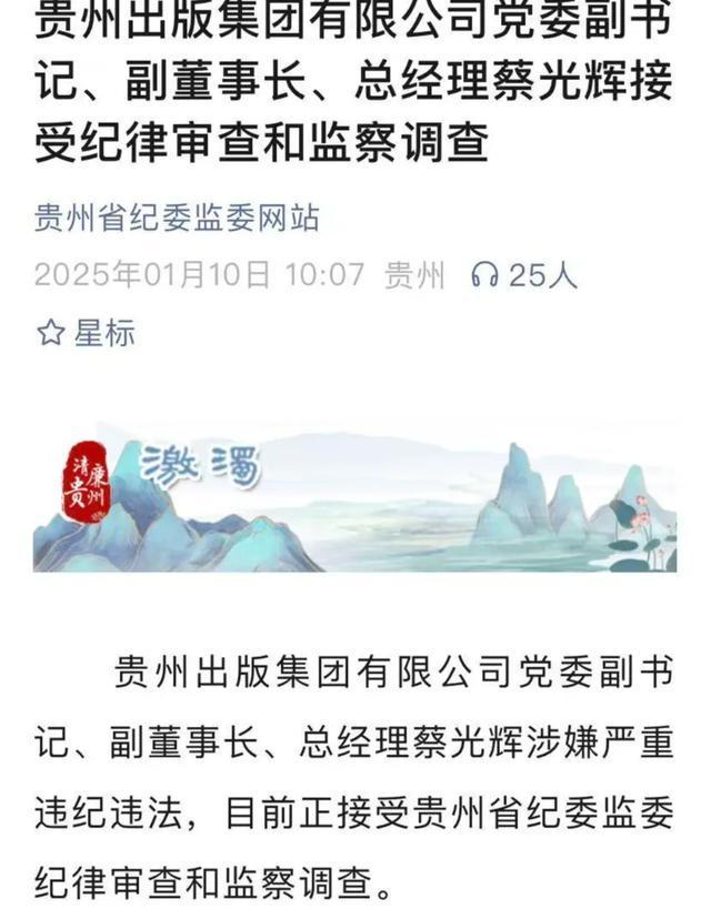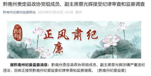 2025年7月25日,贵州省黔南州纪委监委发布消息称,黔南州贵定县政协党组成员、副主席蔡光辉涉嫌严重违纪违法,目前正接受黔南州纪委监委纪律审查和监察调查。 巧的是,半年前的2025年1月10日,贵州省纪委监委发布消息显示,也有名为蔡光辉的厅官落马。通报称,“贵州出版集团有限公司党委副书记、副董事长、总经理蔡光辉涉嫌严重违纪违法,目前正接受贵州省纪委监委纪律审查和监察调查。” 更巧的是,同为蔡光辉的这两名官员,籍贯都是湖南省新化县,年龄只相差一岁左右:“总经理蔡光辉”出生于1974年10月,“政协副主席蔡光辉”出生于1975年11月。