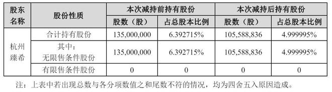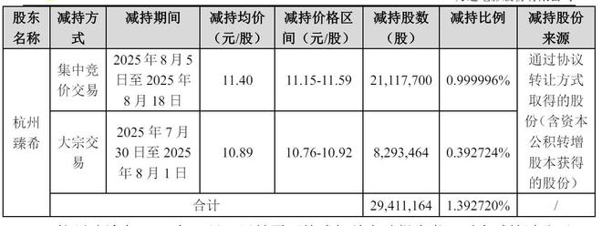杭州臻希在2025年8月5日至2025年8月18日通过集中竞价交易减持21,117,700股,减持均价11.4元,套现2.4亿,减持比例为0.999996%;